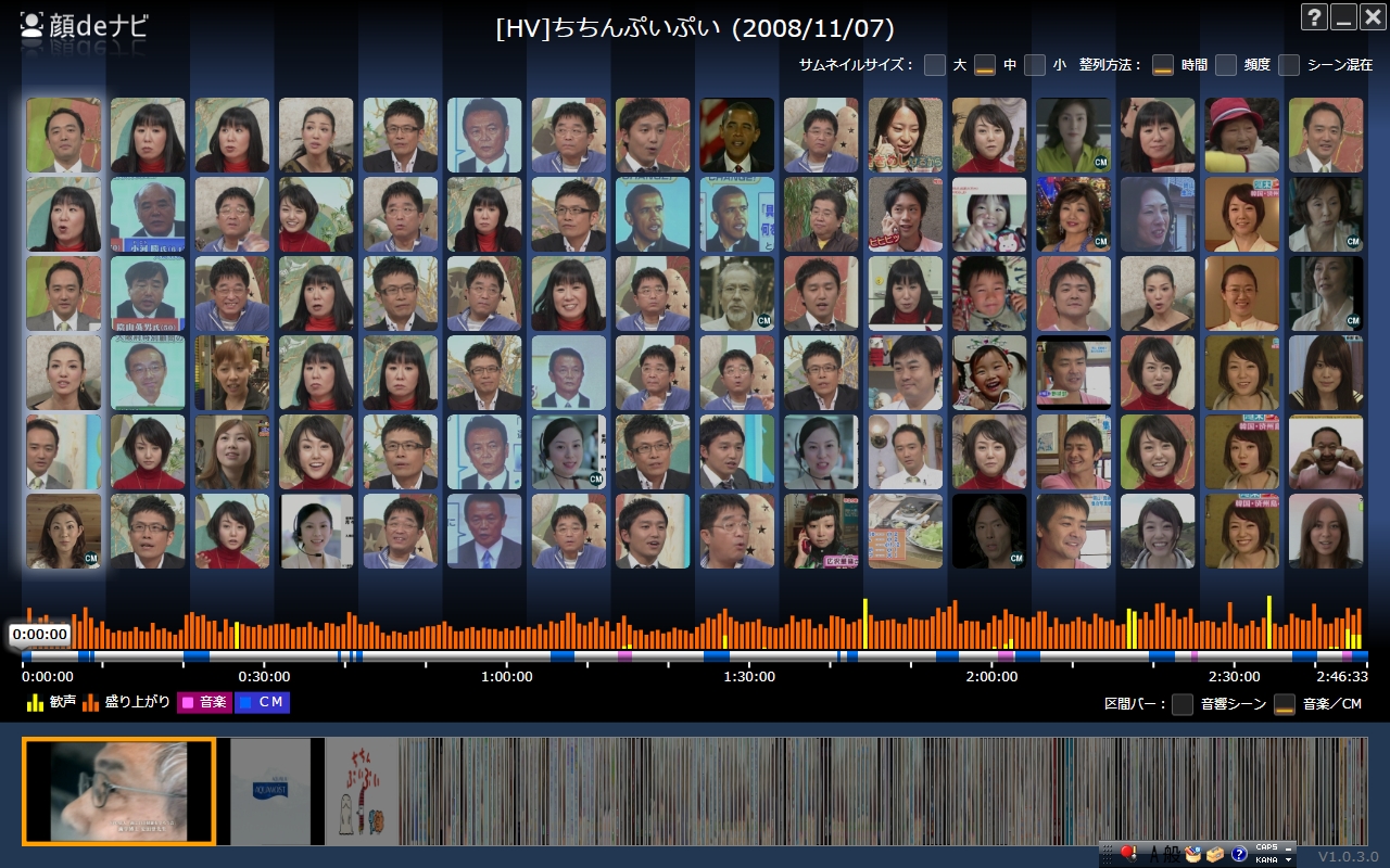 面白そうな機能の一つである顔deナビ。 録画したデータをSpursEngineで顔抽出処理を行い、顔や音の盛り上がりを時系列で並べ、再生場面を選ぶ事ができる仕組みです。